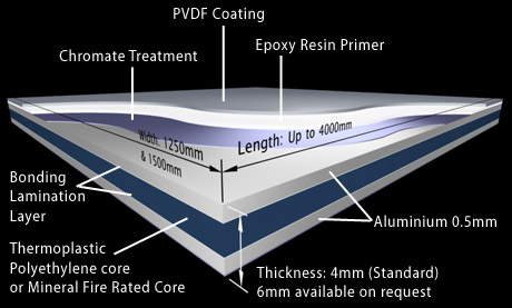 Aluminium composite panel dalam lembarannya akan didapatkan dalam lembaran yang kaku, kuat tapi dalam berat yang cukup ringan. Lembarannnya dapat ditemukan dalam warna metalik dan warna non logam. Untuk pesanan khusus , permukaan dapat dipeesan dalam berbagai pola meniru bahan bahan material lainnya seperti pola kayu, keramik dan pola lainnya.Lembaran Aluminium Composite Panel diproduksi biasanya dengan ukuran ketebalan 1 mm – 10 mm, dan lebar 1200 – 1600 mm.